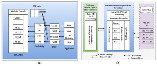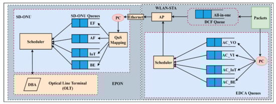 The distributed-coordination function (DCF) model and enhanced distributed-channel access (EDCA) mode of front-end WLAN are depicted in Figure 4a. The basic IEEE 802.11 Medium Access Control (MAC) protocol is DCF, based on the Collision Avoidance (CSMA/CA) and Binary Exponential Backoff (BEB) mechanisms. The pre-specified QoS mapping plan is performed where all data frames (DFs) are represented with a single priority queue (all-in-one mapping) using STA’s DCF model, and QoS is provided in DCF mode. The WiFi-AP has the same QoS configuration and STAs, compete with an equal DCF bandwidth. Moreover, through mapping a CoS for each frame in this scheme, no packet classification is needed for all STA frames, avoiding the associated overhead as in SD-FiWi-IoT. The EDCA is the basic and obligatory 802.11e mechanism; the EDCA classifies traffic flows between four access categories (ACs), each associated with a different transmission queue and acting independently. Therefore, in the EDCA mode, each packet is marked with a user-priority (UP) value that has eight distinct values, i.e., 0 to 7. After marking the packet, it will then be sent to the SD-ONU via the AP. The access category, packets are classified with a right EPON queue (i.e., AC_EF, AC_AF) form in every SD- ONU-AP, as shown in Figure 4b. Packet Classifier classifies the uplink traffic in both the AP and SD-ONU according to their QoS specifications and buffers it into the appropriate priority queues. To the OLT and ONUs, assign DiffServ Code Point (DSCP) values. Additionally, the packet schedulers at the SD-ONU-AP and SD-OLT must use the same packet forwarding approach for EPON and 4G, 5G WLAN/WiFi upstream/downstream traffic with each configured QCI/DSCP value associated with an IP flow. We refer these traffic flows to four sources of traffic types (VOICE, VIDEO, IoT (Alarm), HTTP). The H2H, MTD (IoT) services and applications are listed in Table 2.