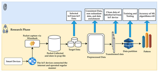 After the IoT network traffic data are captured, the data are then subjected to pre-processing. The pre-processing block is in charge of receiving the captured file in packet capture (PCAP) format and collecting the necessary information. The block is composed of two functions: identification of traffic and variable extraction. Each packet is labeled by the traffic identification feature according to the system from which it originated: IoT or non-IoT device traffic. This is important because the classifier is supervised by machine learning. The data extraction task generates a collection of statistical variables from information contained in packet headers and payloads. Subsequently, the extraction of features is performed by determining strategies to handle missing fields and altering data as required. Then, useful features that can be used to represent the data are extracted, depending on the goal or task (i.e., the data are transformed using the labeling of IoT/Non-IoT Traffic). The effective number of variables under consideration can be reduced or invariant representations for the data can be found using dimensional reduction or transformation methods. The transformed features include port source and destination numbers, IP source and destinations, domain name services (DNS) and NTP, packet size, etc. Further, the extracted features are used to train and test the ML classifier [40].