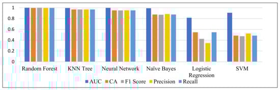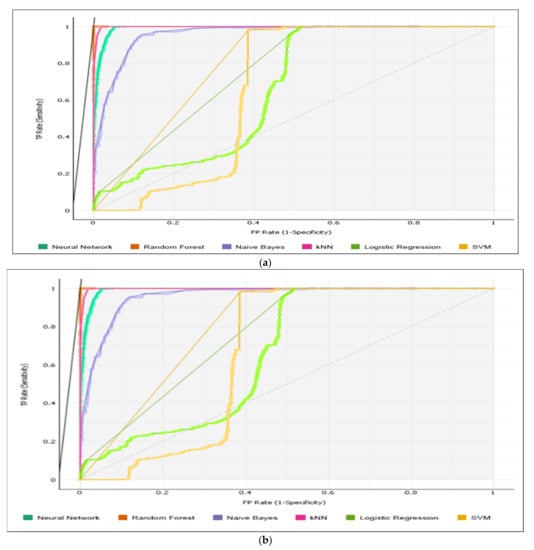 This block contains the implementation step; this process involves determining which models and parameters could be suitable and matching a specific data-mining method to apply ML classifiers to different instances. We used six well-known data classification machine learning classifiers. ML algorithms are used: Random Forest (RF), (SVM), K-Nearest Neighbor (KNN), Neural Network-Multi-Layer Perception (MLP), Naive Bayes, logistic regression and Support Vector Machine (SVM). These algorithms and technical details are described as follows. First, a Random Forest is a meta-estimator that fit a set of decision tree classifiers on different dataset sub-samples and uses an average to boost predictive accuracy and control over-fitting issues. Further, RF is an ensemble ML algorithm. Second, a supervised, non-parametric classification method is k-Nearest-Neighbors (KNN). In the technique, k training samples are found with relatively similar (closest) attributes to test samples. These samples are called Nearest-Neighbors. Third, in a neural network, MLP uses a supervised learning technique called backpropagation. Its multiple layers and non-linear activation distinguish MLP from a linear perception. Fourth, the NB is a method used to classify data, based on the Bayes theorem. This paper is used on the gaussian naive Bayes. Fifth, LR is a statistical analysis technique that employs regression analysis to ascertain a quantitative relationship between two or more variables in mathematical statistics. Finally, the SVM is an ML technique that separates the attribute space with a hyperplane, maximizing the margin between different class or class value instances. The technical details of the studied classification techniques are tuned and the parameters are given in Table 3. Moreover, a comparative analysis of the algorithms was performed [41]. Various models were employed for comparison.