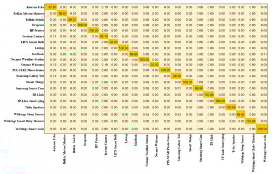In this study, we used a confusion matrix to evaluate the classification performance. Our goal is to classify IoT and non-IoT device network traffic to identify specific devices and improve classification accuracy. To measure the accuracy of the classifier, several performance metrics are introduced. These metrics are calculated using the classification results of the ML classifier [42]. The following performance metrics are frequently used for binary classification: