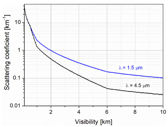 Figure 3, the calculated scattering coefficient for two wavelengths and different levels of visibility is determined (