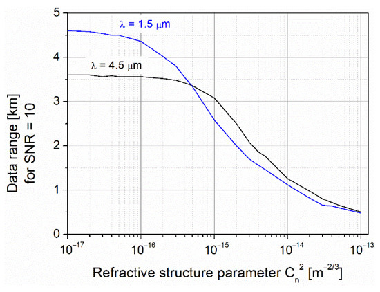 For weak and very weak turbulence, the data range is constant (above 3.5 and 4.5 km) for 4.5 and 1.5 µm wavelengths. If the refractive structure parameter increases above 5 × 10−16 m−2/3, the range starts decreasing, but the longer radiation wavelength provides an extended range.