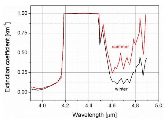 2O absorption lines in this spectral ranges. The averaged wavelength ranges were 4.45–4.55 µm and 4.75–4.85 µm, for the pulsed laser and the cw laser, respectively. It was assumed that there were no differences in the scattering effect for these radiations because of their comparable wavelengths. The averaged extinction coefficient values for summer and winter at the latitude corresponding to Poland are presented in