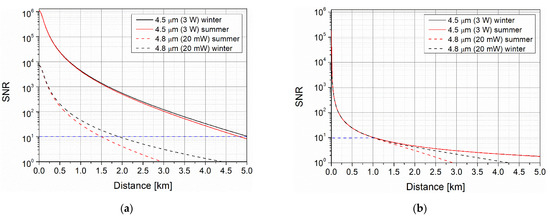 20]. The HITRAN database analysis shows that for a wavelength of 4.5 µm, the air transmission at a distance of 1 km is at least 22% lower as compared with a wavelength of 1.5 µm. For rain and snow, the relationships between particle sizes and radiation wavelengths indicate no spectral benefits [
