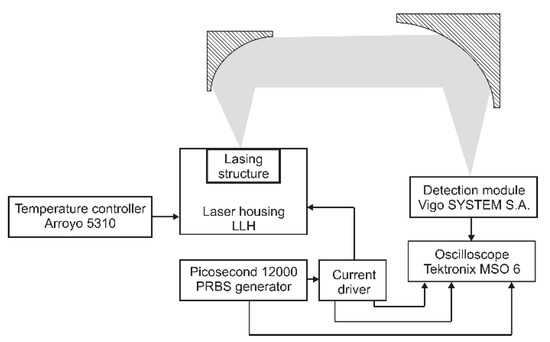 During the tests of a free space data link, laser structures were placed in an LHH model housing device (Alpes Lasers S.A., Switzerland) which connected a driving current signal to a laser structure placed on a standard copper submount and controlled the temperature using a two-stage TEC module. The triggering signals for the current driver were generated in a pattern signal generator model Picosecond and collimated with an off-axis parabolic mirror. To monitor laser current pulses, the current probe model CT-1 Tektronix (Tektronix Inc., Beaverton, USA) was also applied. The registered pulses were visualized and processed in an oscilloscope model MSO 6 Tektronix with a built-in eye diagram toolbox. The schematic setup of the FSO system is presented in