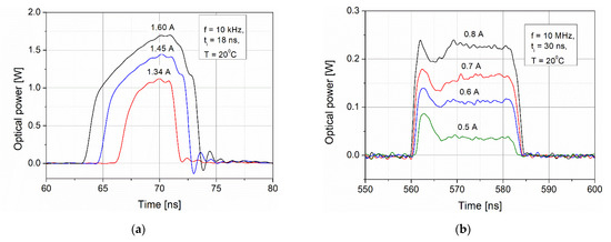 Figure 10. For the pulsed laser, it can be observed that there is a strong influence of current on amplitude and time duration of light pulses. By decreasing the current, a decrease in both optical pulse amplitude and its time duration (min. duration time ~5 ns) is noted. In the case of the cw laser, the driving current directly influences the radiation pulse power. However, the shape of these pulses (time duration) has not been changed. Although the average power of this laser is 20 mW, the obtained peak power for the duty cycle of 30% is ~220 mW. In this case, the pulsed operation mode of this laser results in a better data link.