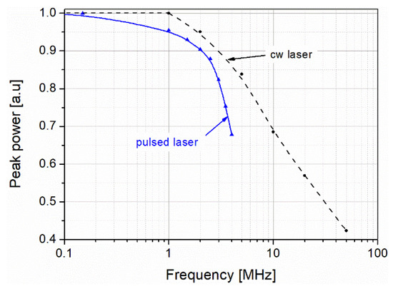 Figure 11). The pulsed laser is more sensitive to duty cycle changes and a four-times higher duty cycle decreases the pulse power by about 30%. For the cw laser, the same decrease is measured for a 10-times higher duty cycle.