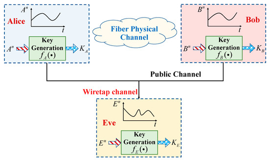 A promising and cost-effective approach is to take advantage of the unpredictable and random characteristics of the transmission channel to convert the random characteristics of the environment into a secure key. In this approach, the key is only highly correlated to the legitimate users (Alice and Bob), but not to the signal being eavesdropped on by Eve. This idea has already been put into practice in wireless and fiber-optic communications systems. In a wireless communication system, for key generation, the random fading effects of the wireless channel are utilized [9,10], such as received signal strength, channel impulse response, and frequency phase in key distribution schemes [11,12].