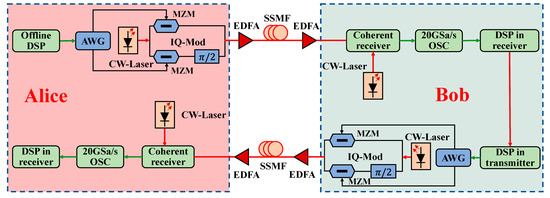 As shown in Figure 4, the data transmission rate of the scheme is 10 Gbps, the optic fiber link is 200 km, the laser transmitting power is 1 mW, and the wavelength is 1550 nm. The sending process of the scheme is as follows: Firstly, Alice obtains the orthogonal frequency division multiplexing signal encrypted by quantum noise stream through DSP processing. Next, the signal is converted from digital to analogue through the arbitrary waveform generator (AWG), and the electrical signal is modulated onto an optical carrier using an I/Q modulator. The signal amplified by erbium-doped fiber amplifier (EDFA) enters the optic fiber link to Bob’s terminal. It is demodulated by the coherent receiver and sampled by a 20 GSa/s oscilloscope (OSC). Bob converts the signal to analogue through AWG and then modulates it to the optical carrier using the I/Q modulator. After passing through the amplifier and optic fiber link, Alice’s coherent receiver carries out coherent demodulation on the signal. The demodulated data are sent to an OSC for sampling (sampling rate = 20 GSa/s). Finally, Alice performs DSP processing on the sampled signal. There are simulation-specific parameters, as listed in Table 1.