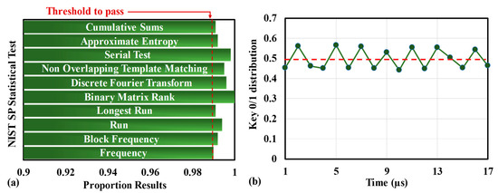 (a) Key NIST test results, and (b) 0/1 distribution probability of the key.