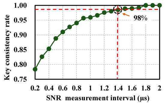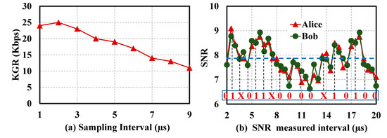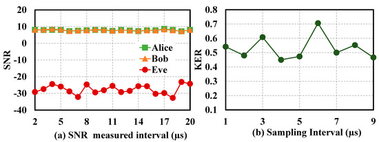 Key consistency comes from precise channel reciprocity, so Alice and Bob share a highly related key source. According to the physical characteristics of the reciprocity of the channel, a consensus key is generated. The reciprocity of the channel mainly improves the consistency of the key. The metric characteristic of the channel generated by the key is the SNR. As shown in Figure 6a, the KGR of the system first increases and then decreases. With the increase in the SNR sampling interval, the calculation of BER requires more data bits, leading to the decrease in the KGR. When the sampling time is 2 μs, the maximum KGR is 25 kbps. The amount of data obtained at each sampling point is relatively insignificant when the sampling interval is very small, leading to a relatively severe miscalculation of SNR. Therefore, the SNR values calculated by Alice and Bob are inconsistent, which affects the KGR. When the sampling interval is large, the SNR value calculated within the same amount of time is relatively small, leading to a relatively low KGR rate. Therefore, it is necessary to set a reasonable sampling interval to obtain a relatively high KGR. It is obvious that faster fluctuation of channels corresponds to a smaller sampling interval, thus extracting more channel feature and generating more secret keys.
