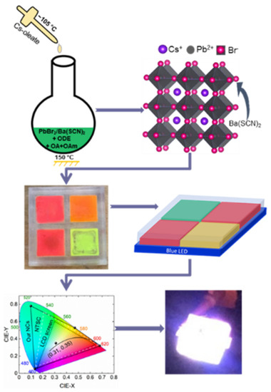- Thapa, S.; Adhikari, G.C.; Zhu, H.; Zhu, P. Scalable synthesis of highly luminescent and stable thiocyanate based CsPbX3 perovskite nanocrystals for efficient white light-emitting diodes. J. Alloys Compd. 2021, 860, 158501. [Google Scholar] [CrossRef]