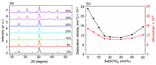 The crystalline structure of CsPbBr3 NCs with the addition of varying molar concentrations of Ba(SCN)2 (0–50%) is analyzed by XRD patterns, shown in Figure 2a. These patterns indicate that the main peaks are at ~15°, 21°, 26°, 30°, and 44°, which correspond to the (100), (110), (111), (200), and (220) diffraction planes of the cubic structure of CsPbBr3, respectively. An identical diffraction peak position observed despite varying concentrations of Ba(SCN)2 implies that the crystalline structure of the NCs is independent of the addition of Ba(SCN)2. A small peak was observed at about 12° for the parent CsPbBr3 NCs, indicating an incomplete transformation of PbBr2 into the CsPbBr3 structure. The peak corresponding to PbBr2 disappeared after the addition of Ba(SCN)2, showing the increased purity in the composition of the new compounds up to a doping concentration of 30%. This result indicates that the presence of barium is expected to limit the formation of metallic Pb from the resulting NCs, which act as non-radiative recombination centers [26]. Calculation of Goldschmidt’s tolerance and octahedral factors suggests that the addition of the guest elements Ba2+ and SCN− is compatible with Pb2+ and Br−. However, the addition affected crystal parameters, such as the crystallite size (L), dislocation density (ẟ), and microstrain (ϵ). L is calculated using the Scherrer equation [27]:
