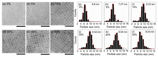 (a–f) TEM images (scale bar set to 50 nm) of CsPbBr3 NCs with the addition of different molar concentrations of Ba(SCN)2. (g–l) Histogram of the corresponding sample showing the size distribution of the particles. The statistical charts indicate that the size of the particle increases up to a critical dopant content and decreases thereafter.