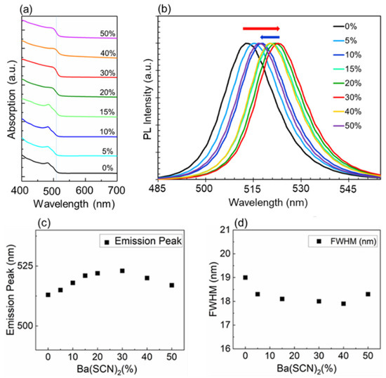 (a) Absorption spectra, (b) normalized PL emission spectra, (c) variation of PL emission peak wavelength, and (d) variation of PL FWHM of CsPbBr3 NCs with the addition of different molar concentrations of Ba(SCN)2. The absorption and the corresponding PL emission peak first exhibit the red-shift in the peak position up to a critical doping concentration and a blue-shift thereafter.