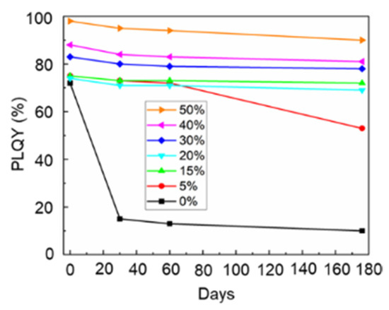 The optical properties of as-synthesized NCs are studied using absorption and PL emission spectra in Figure 4. The absorption onset (Figure 4a) is found to shift to longer wavelengths with the addition of Ba(SCN)2 and becomes saturated at 30% of Ba(SCN)2. Beyond this critical dopant, it is blue-shifted. The bandgap is calculated using Tauc Plot. The values are recorded in Table 1, and the variation of the bandgap with various concentrations of Ba(SCN)2 is shown in Figure S1b. For 0% of Ba(SCN)2, the bandgap is 2.450 eV; at 30%, it decreases to 2.413 eV; and at 50%, the bandgap increases to 2.418 eV. A similar trend is noticed in the PL emission peak position (Figure 4b), which is summarized in Table 1. A variation of the peak position with various mol% of Ba(SCN)2 is shown in Figure 4c. The corresponding PL emission peaks are 513 nm, 523 nm, and 517 nm, respectively, under the excitation wavelength of 365 nm. It should be noted that the fluctuation in optical properties is caused by variation in the size of the as-grown particles for different concentrations of Ba(SCN)2. It is generally accepted that the lead halide perovskites are defect-tolerant, due to the ionic nature of the material or the orbital composition of the energy bands [43]. This property is responsible for the optical transition after the addition of guest elements. In addition, the difference in the electronegativity of B-site and X-site elements plays some role in changing the energy gap and optical properties due to the orbital overlap [22,44]. The FWHM of the PL emission spectra of the samples is found to decrease after the addition of Ba(SCN)2, falling in the range of 19.07–18.07 nm. The variation of FWHM with the amount of Ba(SCN)2 added is shown in Figure 4d. The spectral purity of the light emission is demonstrated by the lowered value of FWHM of the PL emission. The PLQY of as-grown NCs is calculated (Figure S2) and compiled in Table 1. The PLQY is enhanced from 72% to 98% when the amount of dopant is increased from 0% to 50%, due to the combined effect produced by Ba2+ and SCN−. As a result, surface defect states, such as dangling bonds, surface imperfections, etc., are eliminated, favoring the reduction of non-radiative decay and enhancement of PLQY of the NCs [38]. Xiang et al. also demonstrated that the addition of Ba2+ into the parent CsPbBr3 lattice effectively inhibits non-radiative recombination [26]. These results indicate that the addition of Ba(SCN)2 could help tune and enhance the optical properties of the host CsPbBr3 NCs. Time variations of PLQY of the as-prepared samples with different concentrations of Ba(SCN)2 are summarized in Table S2 and plotted in Figure 5. The samples with Ba(SCN)2 (>15%) retained the PLQY (>92% of the original value) even after prolonged exposure to an ambient atmosphere. However, the undoped sample retained very low PLQY (<13% of the PLQY of the fresh sample) and PL intensity. One hypothesis could be attributed to water molecules absorbed by pristine NCs, which may penetrate their structures, thereby deteriorating the colloidal integrity and degrading the luminous property. The durable performance and stability of the Ba(SCN)2-added samples in an ambient atmosphere could be ascribed to the passivation effect of Ba(SCN)2 which resulted in the reduction of defect concentrations. Furthermore, Ba(SCN)2 acts as a ligand that may inhibit the penetration of water into the core structure of the perovskite materials. The PL emission spectra of the fresh and aged samples for the various concentrations of Ba(SCN)2, indicating a blue shift in the peak position, are depicted in Figure S3. The displacement in the peak position suggests the photo-oxidation and photochemical degradation of the NCs, which was also demonstrated by the additional decrease in PLQY [45]. This shift is smaller with 50% of Ba(SCN)2, which demonstrates that the addition of 50% dopant is feasible to obtain more stable and higher-quality NCs. Furthermore, it is noted that the FWHM of the doped NCs has not significantly increased compared to the undoped samples (Figure S3) over a long period (+176 days). This suggests that the doped NCs maintain the purity of the color emission. For visualization, photographs of the colloidal solution of as-synthesized NCs (fresh and 176 days aged) under UV light are taken and shown in Figure S4. It is observed that all the fresh samples (Figure S4a) produced excellent luminous behavior. The samples without Ba(SCN)2 have seemingly degraded into an almost non-luminescent state after aging; however, the addition of Ba(SCN)2 stabilized the NCs (Figure S4b). The prolonged stability could be attributed to the protection of the NCs with defect reduction in the presence of Ba2+ and bonding interaction of Pb2+ with S and N, which is very strong due to the linear shape of SCN− [30]. Thus, the prolonged luminous behavior of the Ba(SCN)2-doped samples can be promising in applications for device fabrication.