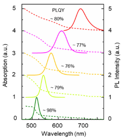 - Polavarapu, L.; Nickel, B.; Feldmann, J.; Urban, A.S. Advances in quantum-confined perovskite nanocrystals for optoelectronics. Adv. Energy Mater. 2017, 7, 1700267. [Google Scholar] [CrossRef]