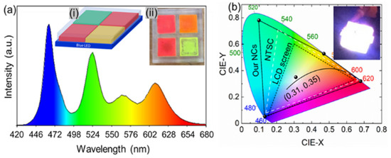 Furthermore, we found that the luminous property of as-fabricated perovskite NCs is excellent, including a narrow linewidth of emission spectra and a wide color gamut, indicating promising applications in white light emission. However, halide perovskites have an anion exchange reaction and instability issues when mixed and thus cannot be simply mixed to produce white light compared to Cd-based quantum dots [15,47]. On the other hand, when these NCs are directly coated onto blue/UV LED chips, the device experiences thermal instability because of the heat produced during the working cycle of the LED chips. Several studies have addressed these issues by using the remote phosphor technique of stacking glass plates containing different NCs as conversion layers over the blue/UV LED chips. In this configuration, the phosphors were exposed to less heat released from the chips due to the air barrier maintained between them. This non-contact configuration effectively eliminates the direct effect of heat on the phosphors without interfering with the LED junction. However, the multiple conversion layers over blue/UV LEDs suffer from reabsorption of light. For the first time, we fabricated a white LED using a 3D-printed single-color conversion layer utilizing a multipixel design to address these issues. The schematic diagram of the as-designed white LED is shown in the inset of Figure 7a(i). By using a clear UV-resin, we printed a 3D squared case with a multi-box design and dropped the desired amount of colloidal solution of different NCs into the individual boxes. Next, the samples were dried inside the vacuum oven at room temperature. The NCs were capped using epoxy resin to guard against deterioration from atmospheric moisture and air, as shown in the inset of Figure 7a(ii). This technique eliminates any anion-exchange reaction between the different halides, coffee-ring effect (the dispersing of NCs along the perimeter after drying, which normally occurs when spin-coating or when the colloidal solution of NCs is simply dropped on plain quartz/glass substrates), the direct heating effect on the phosphors from the LED chips, and reabsorption of light which commonly occurs in multi-layer conversion methods. It also excludes the cumbersome task of preparing multi-layers and stacking them on top of the blue/UV LEDs. We found that the 3D-printed multiplex conversion layer has a little detrimental effect on the luminescent property of the phosphors because of the excellent transparency of the UV resin. The white LED is fabricated based on the remote phosphor technique using a 3D-printed, transparent, multiplex-designed, single-color conversion layer. We used green (λ ~ 517 nm), yellow (λ ~ 572 nm), and red (λ ~ 615 nm) emitting NCs as different phosphors, which are pumped by the blue LED chips. The fabricated LED shows an emission peak of about 460 nm and runs at 3.97 mA and 7.50 V. The EL spectrum of the emitted white light is measured (Figure 7a) to analyze the color quality. Discrete peaks located at about 460 nm, 517 nm, 572 nm, and 615 nm are obtained, indicating the elimination of the anion exchange reaction between the different halides. The discrete peaks of the EL spectrum belonging to the blue LED, green-, yellow-, and red-emitting NCs, respectively, demonstrate a good combination of phosphors to obtain white light. Figure 7b represents the CIE (Commission Internationale de l’Eclairage) color system of the XY chromaticity diagram, used to compare the quality of the light source through mapping colors visible to the human eye in terms of hue and saturation. The area enclosed by the CIE diagram (smooth blue lines) represents the range of colors that human beings can see using naked eyes. The three triangles indicate the color gamut of the LCD TV screen (dotted black lines), the National Television Standards Committee’s (NTSC) TV screens (dotted white lines), and the as-synthesized NCs (solid black lines). The region within the color gamut demonstrates the capability of the color display per product, compatible with a color gamut. The color gamut of as-synthesized NCs (green, yellow, and red), including blue LEDs, representing a standard capable of displaying a wide range of colors, is larger than that of the NTSC standard and LCD TVs. A photograph of the as-fabricated white LED is shown in the inset of Figure 7b(ii), which produces a bright white light with a CCT of 6764 K, a CRI of 87, and an LER of 333 lm/W. This CCT is considered a cool white light. The high values of CRI and LER are due to the narrow linewidth of emission spectra of as-synthesized NCs. The high value of the CRI also indicates that the as-generated white light renders nearly perfect light, while the high LER points to the high energy efficacy of LEDs. The CIE coordinates of the white light we observed are (0.31, 0.35), as shown in Figure 7b (the center black point on the CIE diagram), and the value of Duv is 0.02, which indicates that the color coordinates of the light source lie in proximity to the Planckian locus (the center black curve on the CIE diagram). Thus, the light source is considered capable of emitting light comfortable to the human eye, even after prolonged exposure. Therefore, the as-fabricated device exhibits excellent color saturation, which is more desirable for general illuminations. These excellent properties of white light illustrate the likelihood of these compounds being used as alternatives to conventional rare-earth element-doped phosphors.