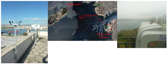 In order to measure the received signal strength for a real FSO system, a 2958-m propagation path was established over Piraeus port entrance at the Hellenic Naval Academy (HNA), Piraeus, Greece. A commercial FSO system was used to take RSSI measurements, to compare with the model predictions. Specifically, the FSO system used in the experiments is a MRV TS500/155 transceiver, operating at 850 nm with a maximum output power of 150-mW and data rate of 155-Mbps. It utilizes three laser sources with a beam divergence of 2 mrad each and a single receiver with a diameter of 20-cm, a sensitivity of −46 dBm and an avalanche photodetector (APD). It also uses an open protocol to automatically identify and lock on the current data rate and clock. The first terminal was located on the roof of a building at HNA, whereas the second was located on the Psytalia Island lighthouse. The horizontal propagation path was approximately 35 m above the surface of the sea, and over 95% of it was over water. Tidal changes in that area are minimal; therefore altitude changes of the propagation path were ignored. A diagram of the MRV, WS-2000 weather station and the surrounding area are shown in Figure 1. In addition to collecting measured readings from the FSO system, a WS-2000 weather station near the MRV was deployed to measure macroscopic meteorological parameters, including ambient temperature, air pressure, relative and absolute humidity, dew point, solar flux, ultra-violet index, rainfall rate, wind speed and direction. An online weather statistics database, [] was also exploited to take sea temperature measurements from which the air-sea temperature difference was estimated. Measurements from both sensors were taken every minute, twenty-four hours per day.