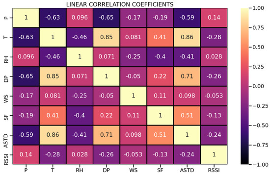 The meteorological data was representative throughout all seasons of a year; therefore, the observed values extended over a large range of environmental conditions. Apart from the descriptive statistics for each meteorological parameter that are presented in Table 1, it is worth observing the correlation between these and the independent value of RSSI. These correlations are shown in a matrix representation in Figure 3, where darker colors indicate negative correlation.