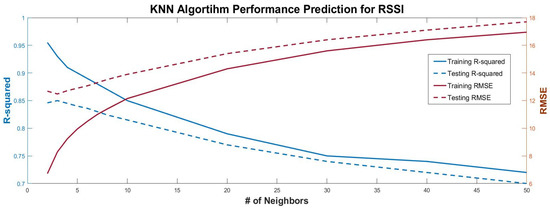 where xi is the input and yi is the output of the model, x0 a prediction point and N0 the K points that are closer to x0. The coefficient of determination, R2 and RMSE for our experimental data set are plotted against various numbers of neighbors (K) in Figure 4, starting from 2 up to 50. As shown in Figure 4, the coefficient of determination for the training subset initiates from a value of 0.95 and then gradually decreases to 0.75 when K = 50. The equivalent values for the testing subset had a peak value of 0.85 for K = 3, meaning that this is the optimal value for the number of neighbors that best fits KNN model to the data set; therefore, is the value we selected for our model A structured process of scanning the training subset (i.e., grid search) to determine the optimal value for a parameter is employed to determine the optimal K value (K = 3).