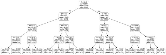 A second simple and easy to interpret algorithm is the DT. Despite not so accurate comparing to other decision tree methods (e.g., random forests), gradient boosting is still a good alternative for regression and classification problems. This algorithm splits the predictor space into several regions and makes predictions based on the mean of the training observations of the corresponding region []. Starting from the root node, a decision tree is constructed via recursive partitioning. Each node is then split into two child nodes, based on the observation parameter that results in the maximum information gain. This process, known as recursive binary splitting, continues until the leaves are pure (i.e., samples at each node belong to the same class). The two basic steps of the DT process include the following []: