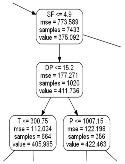 Figure 5 shows the first three levels of the decision tree to predict RSSI. The root node assigns observations where T ≤ 299.65 to the left branch with a corresponding mean RSSI value of 423.452. The right branch (i.e., false outcome) leads to a child node that is further split based on the solar flux value and a corresponding mean RSSI value of 375.092, as shown in more detail in Figure 6. That is, for any training observation that includes a solar flux parameter value less than 4.9, the left branch will be selected and the corresponding values for the dew point parameter will then be examined.
