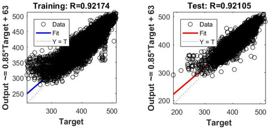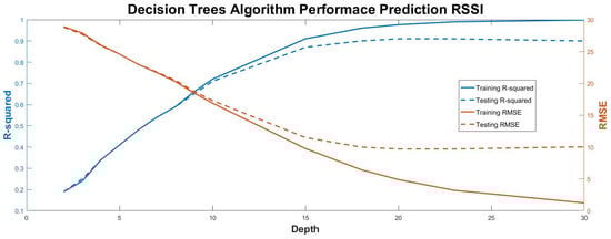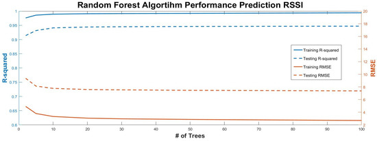 The results of running a RF algorithm in our data set, improved compared to the single decision tree method. A coefficient of determination, R2, for the model evaluation of 0.95 is achieved and is indicative that this occurs with not so many different trees, as shown in Figure 8. Approximately, 20 different trees are sufficient to construct a model with the highest possible accuracy. Therefore, considering the lower complexity of a RF model with less trees and since more trees do not provide better results, we selected a value of 20 for our model. It is also important to notice that training and testing R2 do not coincide for any number of trees; instead, there is a constant difference of 0.05. On the other hand, the RMSE begins with a value of 4.5 for two trees and rapidly reduces to less than 3 for the rest of the number of trees. A significant advantage of the RF algorithm is that by adding more trees we do not risk overfitting [].