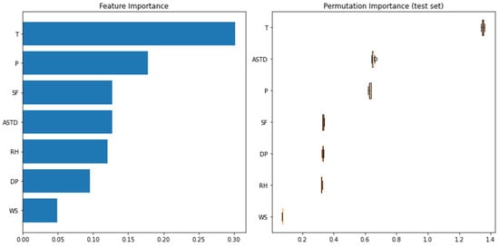 Impurity-based feature importance can be misleading for features with many unique values. As an alternative, we can compute the permutation importance. Permutation feature importance is a model inspection technique that can be used for any fitted estimator when the data is tabular, something very useful for non-linear estimators. The permutation feature importance is defined as the decrease in a model score when we randomly shuffle the value of a single feature []. This procedure breaks the relationship between the feature and the target; thus, the drop in the model score is indicative of how much the model depends on the feature. This technique benefits from being model agnostic and can be calculated many times with different permutations of the feature. For the current test subset, both the impurity-based and permutation methods -as a box-plot figure- identify the air temperature as the most significant predictive feature, whereas the rest of the ranking differs, as shown in Figure 10.