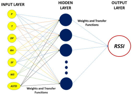 The internal layer perceptrons, those in between the input and output layers, receive the summed weighed values of the input parameters (i.e., temperature, pressure, dew point, solar flux, wind speed, relative humidity and air-sea temperature difference) and provide the “input” signal for the output layer. All three layers are fully connected to each other. The proposed ANN architecture contains seven nodes in the input layer and a single node in the output layer RSSI, which receives the weighted input signals from the hidden layers along with a bias and represents the values of the predicted variable. The architecture of our model is a multi-layer perceptron model (i.e., shallow neural network) and the input-output mapping can be represented as follows: