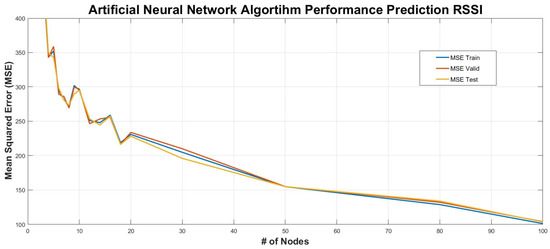 The ANN algorithm applies a three-fold division of the entire data set (i.e., the training, validation and testing subsets). The training data subset is presented to the network during training and the network is adjusted according to its error. The validation subset is used to measure the generalization of the network and stop the training when generalization stops improving. The testing subset is used to independently measure the performance of the network after training. Seventy percent of the entire data set was assigned to the training of the network, fifteen percent to the training validation, and fifteen percent for the network’s performance testing. Figure 12 shows the performance of the MLP ANN algorithm for the RSSI prediction based on the seven meteorological parameters. We trained, validated and tested the algorithm for different numbers of nodes of the hidden layer, which resulted in significant decrease of the model prediction error approximately up to the 20th node. A further increase in hidden layer nodes provides slightly better results but also a substantially bigger computational cost. Figure 13 shows the error distribution for the training, validation and testing subsets, which appears to follow a normal distribution indicative of a very good performance of the prediction regression model, also shown in Figure 14, for a node number of 50 and a coefficient of determination R2 = 0.921, both for the training and the testing phase.