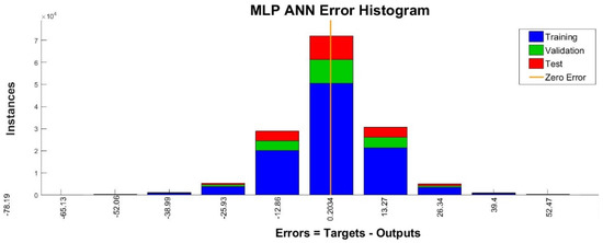 Error histogram of the proposed ANN architecture for RSSI prediction for the training, validation and testing phases.