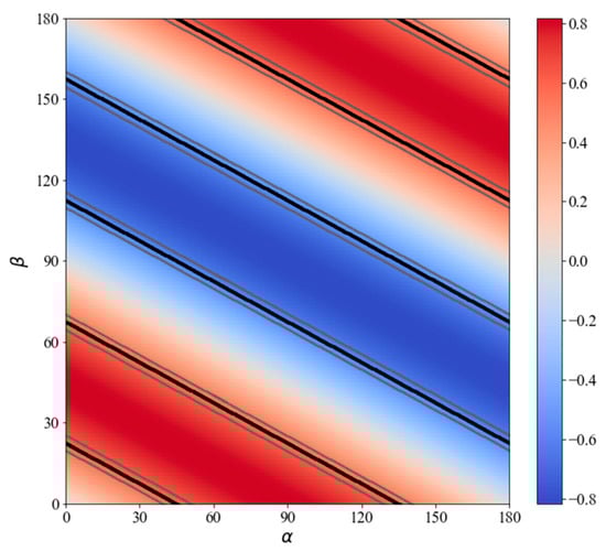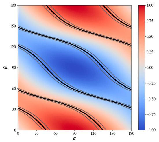 In our study, instead of aiming to adjust the electro-optic detection system to achieve the maximum absolute value of F(α, β), we seek values of angles α and β providing the same sensitivity for two orthogonal terahertz polarizations, i.e., pairs of α satisfying the condition α2−α1 = 90°. For each fixed β in Equation (2), we find pairs of orthogonal α that provide the same sensitivity (see the black curves in Figure 1). The absolute values of F110(α, β) on the found curves vary from to . The grey curves in Figure 1 represent a 10% deviation bound of the optimum value.