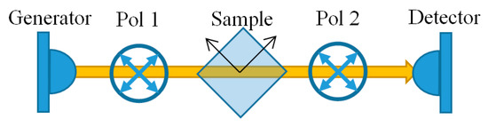 The above analysis, as performed for different THz-TDS detection systems, can serve as the basis for a method to study the properties of anisotropic crystals without optical activity for its two principal optical axes. The starting point is a conventional terahertz generation and detection system setup allowing for the maximum sensitivity. More specifically, the probe radiation polarization angle is set up at β = 0° or 90°, and the terahertz radiation polarization angle is α = 90°. We also utilize two high-performance broadband terahertz polarizers, with the first of those installed after the generator and the other before the detector (see Figure 3). Let φ denote an azimuthal rotation angle of polarizers relative to the same detector crystal axis from which the angles α and β are measured. Initially, both polarizers are also set at an angle of φ = 90° that corresponds to the maximum transmission of terahertz radiation.