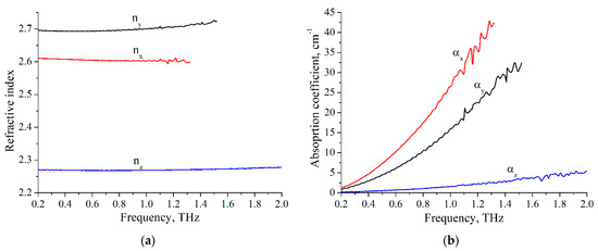 The measurement results obtained at room temperature are presented in Figure 4. The optical properties agree well with the previous measurements obtained by our team [28,29] and recent results from other groups [30,31]. The only discrepancy in the results is the axis labeling, which was discussed earlier [28]. The shorter spectral range of the y- and x-axes is explained by the higher LBO absorption of these axes and the lower dynamic range of the spectrometer at higher frequencies. The lower dynamic range is due to some losses of terahertz signal in our method, as discussed previously, and due to reflections and absorption in the optically thick quartz windows of the cryostat.