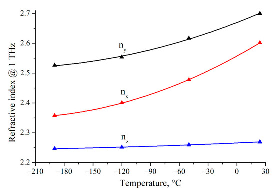 With the help of the proposed method, we were able to measure the temperature dependence of the terahertz optical properties of the crystal for all three axes. The results of the refractive index at a frequency of 1 THz are presented in Figure 5. As can be seen from the figure, the refractive index decreases with cooling by 0.24, 0.17, and 0.02 for the optical axes x, y, and z, respectively. We used temperature-dependent expansion coefficients from [32] to adjust for temperature-related changes in the thickness of the samples. The LBO crystal has a positive expansion coefficient (ranging from 60.4 × 10−6 K−1 at room temperature to 11.5 × 10−6 K−1 at the liquid nitrogen temperature) along the a-axis; therefore, the a-cut sample shrank down to 2050 μm after cooling. Due to the negative expansion coefficient (ranging from −49.5 × 10−6 K−1 at room temperature to −11.6 × 10−6 K−1 at the liquid nitrogen temperature) for the c-axis, the c-cut sample expanded up to 2082 μm. As both samples allowed for the measurement of optical properties for the z-axis, we were able to crosscheck the results, which agreed well within the measurement uncertainty.