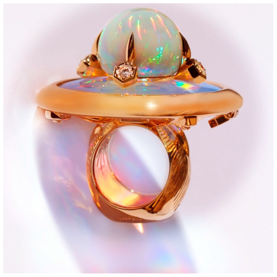 Couture 18K gold ring set with diamonds, opal, and a dichromated gelatin reflection hologram encapsulated in fused silica. Created by Mirasety, a collaboration of Francesco Mazzero, Michael Crawford, and August Muth (Courtesy Mirasety, photo by Francesco Mazzero).