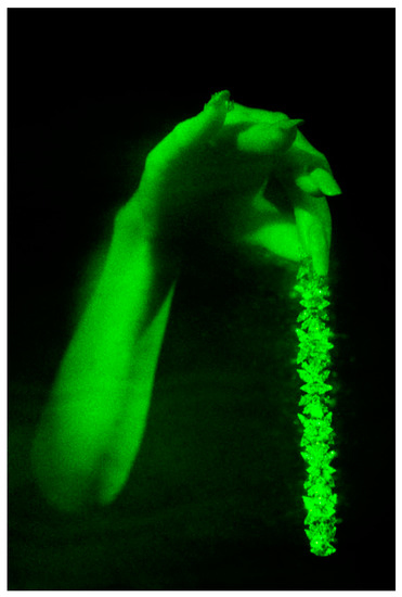 Credited as the first successful use of holography to promote luxury merchandise, a 50-by-60 cm pulsed-laser transmission hologram of the Leith and Upatnieks type (Figure 4) [15] was made for Cartier in 1972 by G. Robert Schinella at McDonnell Douglas Missouri, showing a woman’s hand wearing a diamond ring and holding a diamond bracelet (Figure 5). This was mounted in the window of Cartier’s Fifth Avenue location in New York City, and because of this sort of hologram’s requirement for a monochromatic light source, was illuminated by a mercury arc lamp. The hand appeared 36 cm forward on the window [1] (pp. 352–353).