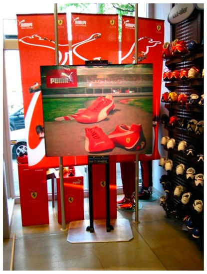 The development of full-color digital holographic printing in the late 1990s and early 2000s, with its ability to create arbitrarily large white-light-viewable reflection holograms without the need of a holography studio—only requiring 3D computer graphics models or sets of 2D parallax views of scenes—greatly increased the potential availability of holography as a promotional medium [4] (pp. 507–511). However, so far, this process does not appear to have been much used in the luxury goods business, one example application in apparel/footwear being a series of large display holograms by XYZ Imaging in 2005. Three 1-by-1.2 m prints and one 1-by-1.5 m print were produced for Puma’s campaign for their Ferrari branded footwear and placed in two Montreal Foot Locker stores during the Montreal Grand Prix in June 2005 (Figure 6). Imagery included close-ups of shoes with a racetrack in the background, and a car morphing into a shoe. In a similar promotional campaign for Nike, four large-format holograms were produced for the Niketown store on Oxford Street in London [18].
