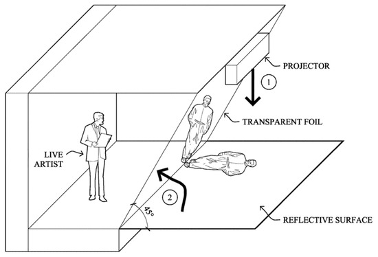 There are several possible geometries for Pepper’s Ghosts; when a virtual model is to share a stage with a live model, the setup in Figure 8 is commonly employed [21]. When based on 2D video projections, as in the examples discussed here, the images are flat rather than 3D, and work best for stationary viewers at distances where 3D visual cues do not operate strongly.