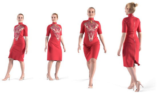 Virtual fashion: stills from an animated video rendered from 3D body scan and 3D garment model (Courtesy Modern Mirror, Inc. New York, NY 10018, USA; garment design by Noe Bernacelli).
