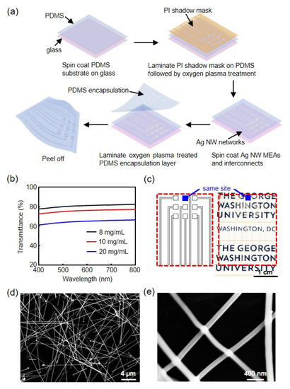 Figure 1a presents the schematic illustration of the fabrication process of the microelectrode array (MEA) and interconnects. Polydimethylsiloxane (PDMS) is used as the encapsulation and substrate material because it is biocompatible, optically transparent, chemically inert, thermally stable, and exhibits a high stretchability [32,33,34]. Firstly, PDMS substrate (~60 μm) was prepared by mixing the base and the curing agent (Sylgard 184, Dow Corning, Midland, MI, USA) at a ratio of 10:1 by weight. After vacuum degassing, the liquid mixture was spin-coated at 1000 rpm for 30 s onto a glass substrate, and thermally cured at 70 °C for 3 h to form a crosslinked PDMS. A laser mill defined ultrathin polyimide (PI) shadow mask film (DuPont, Wilmington, DE, USA) with desired patterns for the MEA, interconnects, and bonding pads was laminated onto the cured PDMS substrate, followed by oxygen plasma treatment (AutoGlow 100, Glow Research, Tempe, AZ, USA) at 20 W for 90 s. Next, the Ag NW/isopropyl alcohol solutions (ACS Material, Pasadena, CA, USA) were sonicated and spin-coated on plasma-treated PDMS at 500 rpm for 50 s. Plasma treatment is known to promote the adhesion between Ag NW and PDMS substrate [35]. Here, Ag NW networks were formed only on the plasma-treated PDMS region since the rest of the areas were still covered by the shadow mask. The resulting films were dried at 95 °C for 120 s. The PI shadow mask was then peeled off from the PDMS substrate. The PDMS encapsulation layer (~60 μm) was prepared in the same manner as the PDMS substrate, with an additional spin-coated polymethyl methacrylate (Microchem, Round Rock, TX, USA) sacrificial layer on the glass slide. The microelectrode opening areas on the PDMS encapsulation layer were defined by laser milling. The PDMS encapsulation layer was released in acetone, treated with oxygen plasma, and quickly laminated on the Ag NW/PDMS substrate. The completed device was peeled off from the glass slide.