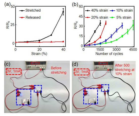 (a) Relative changes of resistance under stretching strain. (b) Relative changes of resistance after cyclic stretching cycles to different strains. R0 is the resistance before stretching, whereas R represents the resistance at a specific stretching cycle. The results are averaged over 5 devices. Photos of an operating blue LED connected by Ag NW/PDMS films (c) before and (d) after 500 stretching cycles at 10% strain.