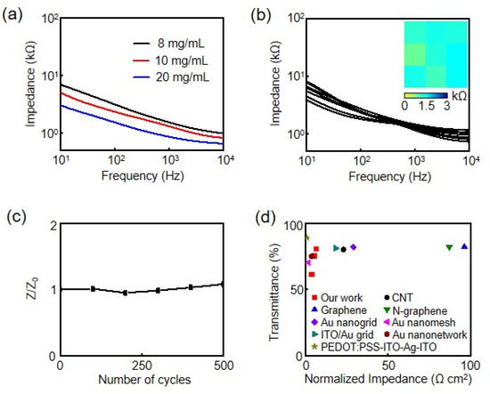 (a) Impedance plot of the Ag NW microelectrodes. (b) Impedance spectra of all 9 microelectrodes in a 9-channel Ag NW MEA. (c) Variation of impedance versus stretching cycle for Ag NW microelectrodes at a strain of 10%. Z0 is the initial impedance, whereas Z represents the impedance at a specific stretching cycle. The results are averaged over 5 devices. (d) Normalized impedance of Ag NW microelectrodes versus transmittance compared to major reported flexible transparent microelectrodes such as CNT [14], graphene [16], nitrogen-doped graphene (N-graphene) [40], Au nanogrid [17], Au bilayer nanomesh [41], ITO/Au grid [42], Au nanonetwork [18], and PEDOT:PSS-ITO-Ag-ITO [20].