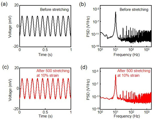 (a) Benchtop recording results from the pristine Ag NW microelectrodes, with a 20 mV peak-to-peak amplitude, 10 Hz sine wave input. (b) PSD of the electrical signals recorded by the Ag NW microelectrodes in (a). (c) Benchtop recording results from the stretched Ag NW microelectrodes, with the same 20 mV peak-to-peak amplitude, 10 Hz sine wave input. (d) PSD of the electrical signals recorded by the stretched Ag NW microelectrodes in (c).