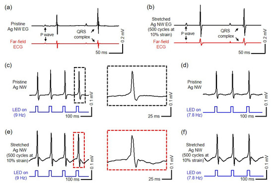 Electrophysiological recordings of heart rhythm from the reference electrode and Ag NW microelectrodes (a) before and (b) after been stretched. EG recording from the pristine Ag NW microelectrodes under optogenetic pacing at (c) 9 Hz and (d) 7.8 Hz, respectively. A representative QRS complex under pacing is shown in (c) (Right). EG recording from the stretched Ag NW microelectrodes under optogenetic pacing at (e) 9 Hz and (f) 7.8 Hz, respectively. A representative QRS complex under pacing is shown in (e) (Right).