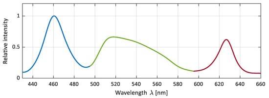Figure 5 illustrates the combined spectral-angular diagram for white light from three spectral channels of the MiniRay projector. The continuation of the diffraction bands at the junction of the spectral ranges confirms the field composition correctness of the MVHGs transfer functions. When forming an image, a shift of the blue spectral part towards negative radiation incidence angles could be expected alongside a shift of the red region towards the positive angles. When creating augmented reality displays based on MVHGs, it is recommended to choose LED sources with a wide spectral band, which is confirmed by the simulation results.