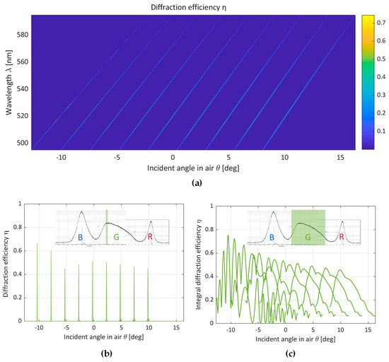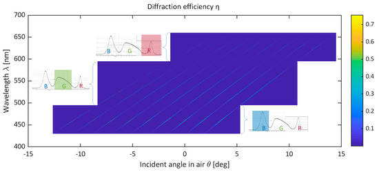 This section considers MVHGs calculated for the image formation in the green part of the spectrum. The parameters for each MVHG are optimized for the calculated propagation direction responsible for the certain section of the angular field. The simulation result, which characterizes the DOE of the nine transmission MVHGs for nine-fold multiplexing, is shown in Figure 3. The angular multiplexing step for the illumination angle of the phase mask in the air was chosen to be Δθ ≈ 2.5°, which corresponds to the fulfillment of the Bragg condition for the spectral range boundaries while providing a relative brightness difference of up to 20%. The thickness of the waveguide was 2 mm, the full refractive index modulation was ∆n = 5 × 10−4, the dispersion characteristics were n(λ) = 4332*λ−2 + 1.48. Figure 3a shows the spectral-angular diagram, each bright selectivity line corresponds to the transformation of a part of the angular field. The angular selectivity contour for transmission gratings is a function of the sine square according to the coupled waves theory.