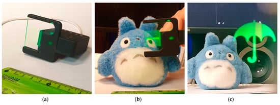 Prototype: (a) appearance; (b) illustration of the waveguide transparency; (c) illustration of augmented information added to the real view.