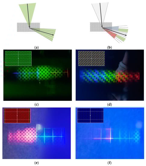The prototype uses the compact commercial projector MiniRay as an image generation module (Figure 2). Figure 7c,d show images of technical tables illustrating the composed angular field of 23° and 32°, respectively. Images of red and blue technical tables in a brighter environment are presented in Figure 7e,f. The angular bandwidth provided by the selectivity contours for a particular wavelength determines the angular resolution limit for the generated image, and also sets requirements for the waveguide wedge. The total angular shift in the plate by TIR propagation from the incoupling DOE to the outcoupling DOE should not exceed a half of the width of the diffraction band. There is a tendency to compensate for the number of reflections (TIR): the ΔθFWHM band is wider for rays propagating in the substrate at smaller angles having a larger number of reflections.